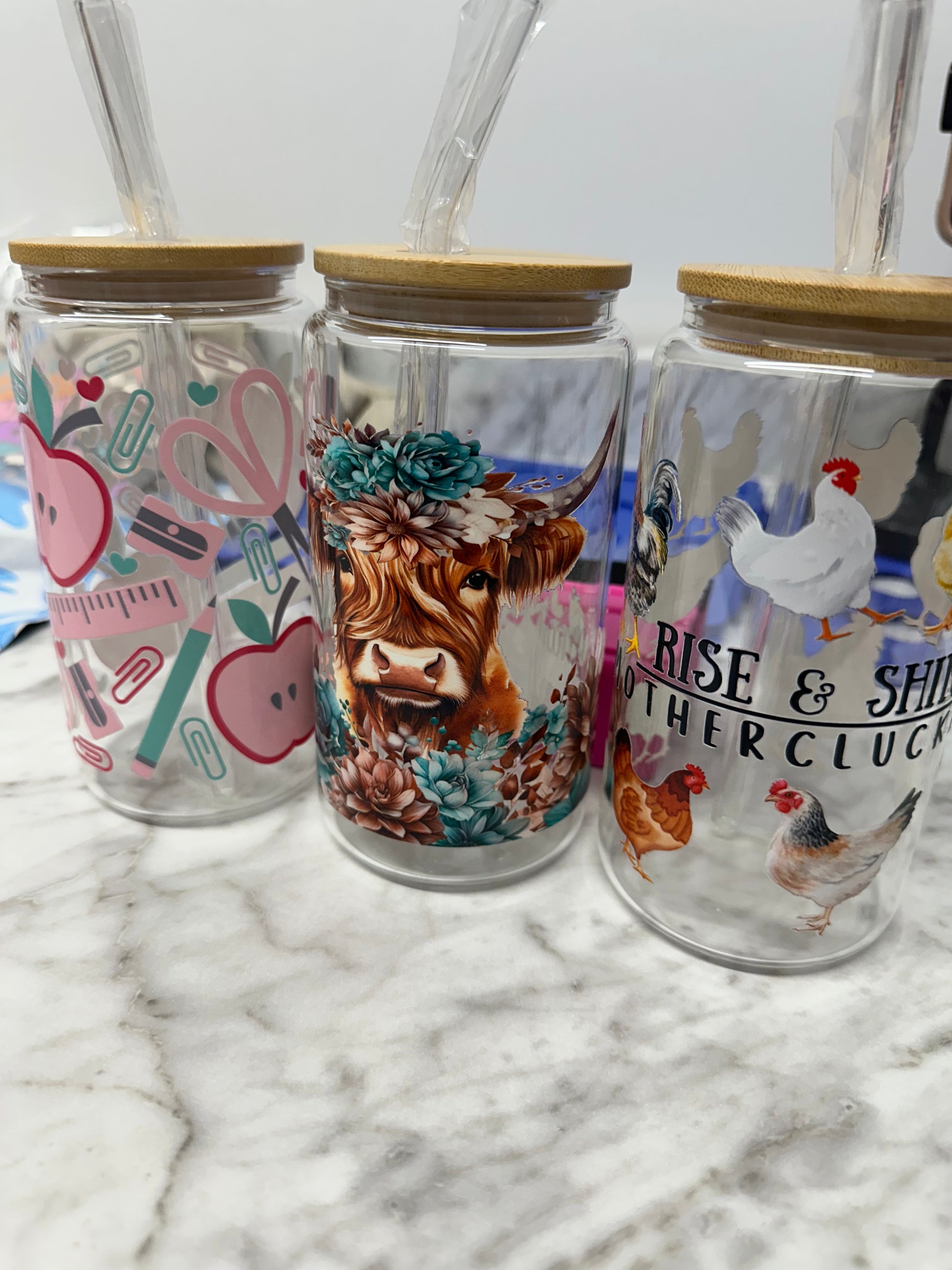 16 ounce glass can with colorful Image. Comes with wooden lid and straw.