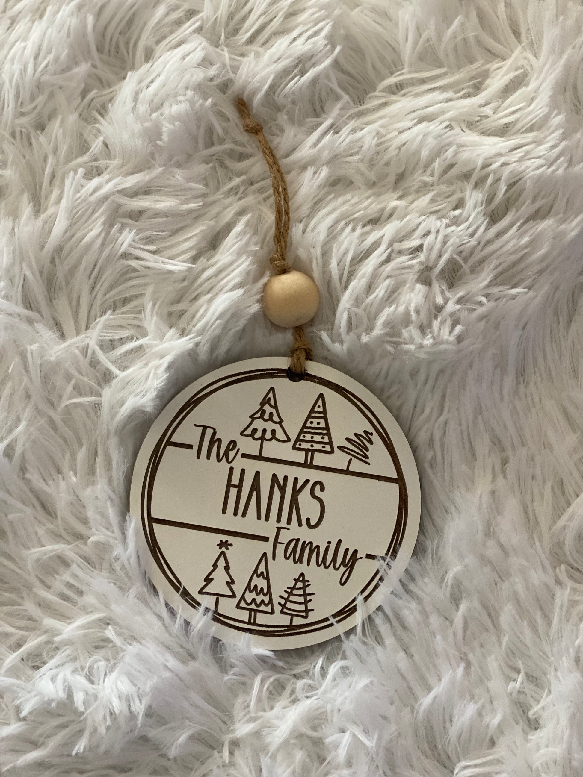 Details: Engraved Family Tree ornament. 4" Round, comes with ribbon for hanging and a wooden bead.