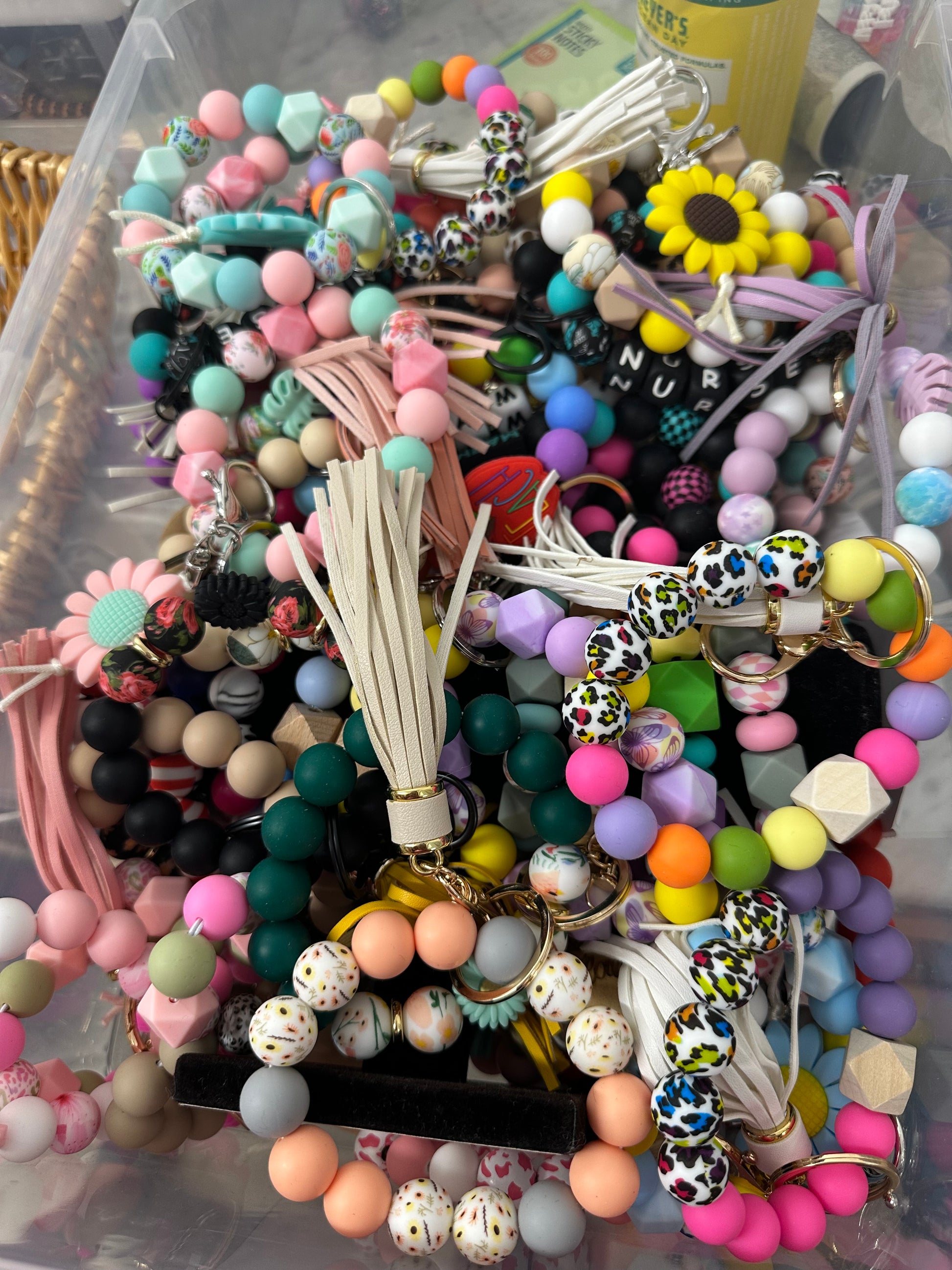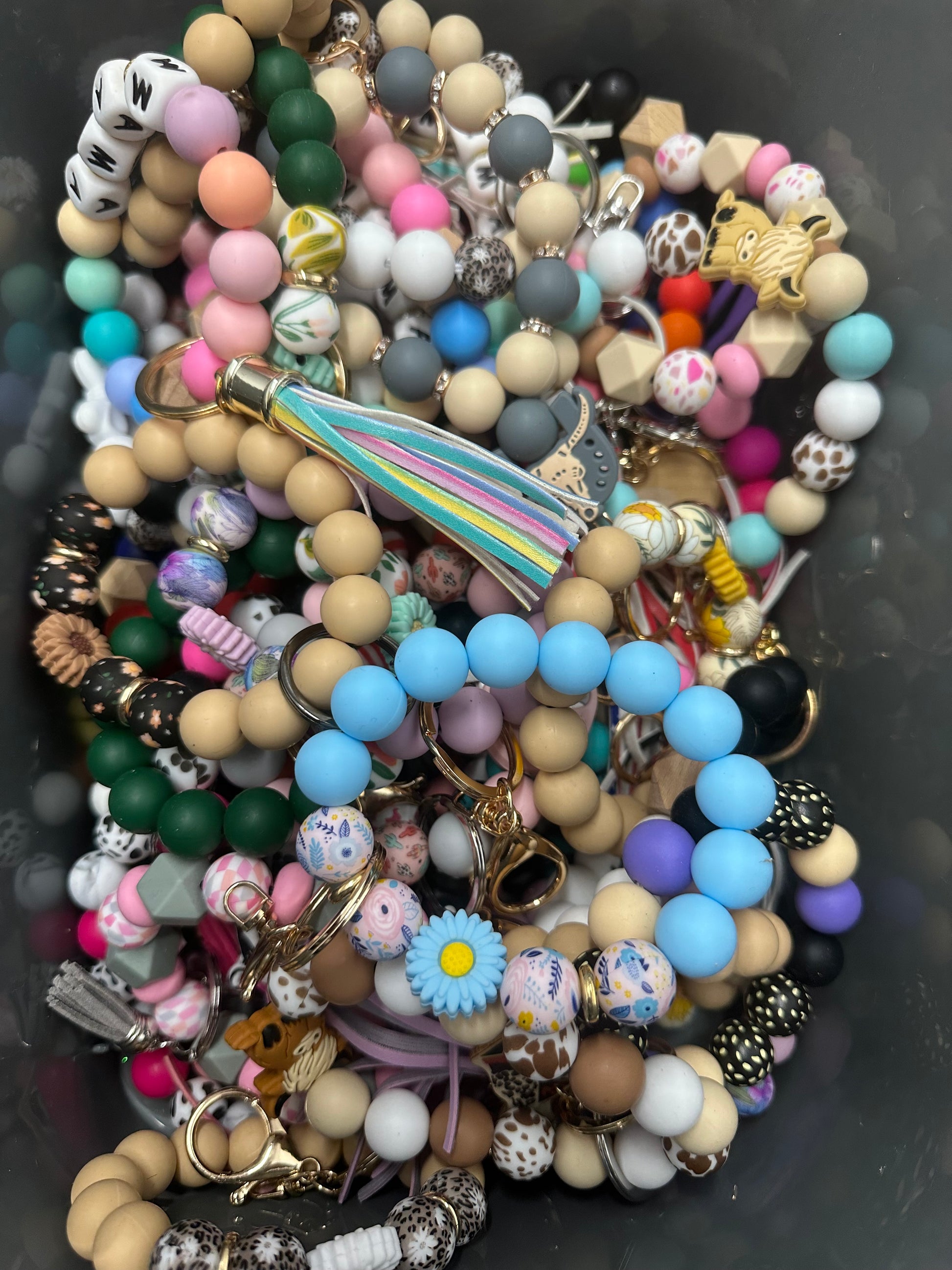These wristlets feature soft silicone beads on a stretchy cord. Also comes with the claw clasp and keyring.